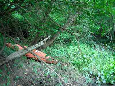 2012-06-06 tl;dr: I'm now seeing bamboo and palmettos. And the airforce. I checked out of my hotel early, carried all my gear down to my hidden kayak, loaded up, and hit the water.I only had one dam to portage. I took the back way around the Columbus Lock and Dam. There was a good north wind, so I broke out my sail again. I think this sail isn't worth the trouble. Perhaps if it were twice as big it would make a significant difference to my speed. I could extend it at my next stop, but the river after that will meander so much that it would again not be worth it. There are palmettos here. And bamboo of a sort. I paddled by the Columbus Air Force Base. I saw many jets. Soon after a pair of circling planes started coming into view. They continued circling over me much of the day -- until I stopped under a thick tree to take a break. I think this has happened to me before. I am a unique enough slow-moving target that I become a practice dummy. There aren't many folks on the river here. The boats are mostly transient; towboats and yachts. The yachts throw up some incredible wakes. Finding a location to camp was much harder than it should have been. Of course when I decided it was time to stop I was still near Columbus, and apparently Columbus has a resident population of I'm-rich-so-let-me-build-a-house-on-the-water people. When I finally passed up all of that I discovered that this stretch of river flows between two twenty foot mud banks that were mostly too steep to climb, let alone pull my kayak up. Even if I were to climb the bank, an imposing jungle waited for me. So I paddled on and on. Eventually I found some sort of gravel road and pulled up on that. I suspect I am on leased hunting land. Bugs and frogs. Dang it's going to be a noisy night. |