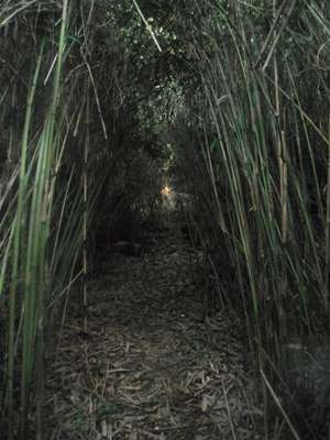 2012-06-21 tl;dr: Tombigbee to Mobile to Tensaw to Bottle to Middle to Tensaw to Blakelley to Interstate 10 to D'Olive Bay. You know what's strange? Every day now for the last month the sun rises at 6 AM and sets at 8 PM. Every day. For me, anyway.I'm on an estuary now. Herons and egrets have been swapped out for pelicans and seagulls. I don't know why I don't take ibuprofen every day. Maybe because the label recommends against it. But when I'm sore and would otherwise wimp out this drug pushes me on. I stopped at Cliffs Landing for lunch. Because it was there, and there was a bar, and it was open. In the afternoon I was trying to decide if I should camp or press on, but the tide started flowing out, pulling me along, and there really was no good place to camp on the grassy shores. I pressed on. I separated from the main shipping channel early in the day and made my way down the delta (as it is apparently called) via various waterways with a decent tailwind. The Tombigbee River had already become the Mobile River. I branched off that onto the Tensaw River, and then onto Bottle Creek. Bottle Creek brought me back around to Middle River which somehow once again became the Tensaw River before splitting off to the Blakelley River. I turned on to Interstate 10 (yep) and exited into D'Olive Bay. To get to a motel, I would have to navigate a couple hundred yards of impenetrable jungle. Then I saw a dock. I remembered that the map showed no private houses along this stretch of coast, so I cached my kayak near the dock and followed the trail hacked through the bamboo up to a...private house. The owners were a bit dismayed, the lady waiting at the front door for me as I approached. I explained and apologized for the trouble, and they indicated that they owned guns, but I could leave my kayak until I was able to move it. |