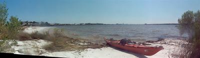 2012-06-28 tl;dr: I'm off Mobile Bay and paddling my way along the Intracoastal Waterway. I spied more dolphins, but the pelicans seem to be left behind at bay.All of the stores at Lulu's Marina were still closed when I arrived, but there was a shower room that I took advantage of, and I filled up my water bottles. There is a small string of islands near Orange Beach. I stopped there around 4 pm. Camping is actually allowed. I thought I would. After waiting around for two hours I decided I'd rather camp someplace where I probably wasn't supposed to be. So I paddled out of town, into Florida, and laid my sleeping back out in Preserve. I am not bothering with a tent as I do not anticipate mosquitoes. And I wanted to remain inconspicuous. But mostly because it's warm even here on the coast. Just before stopping to camp for good, I climbed over the sand dunes and received my first real glimpse of the Gulf of Mexico. |