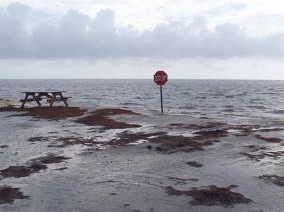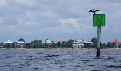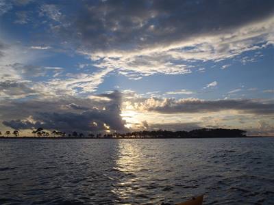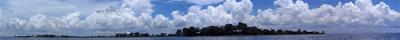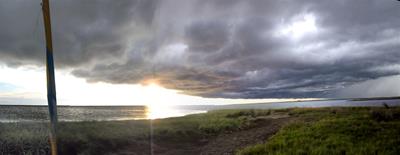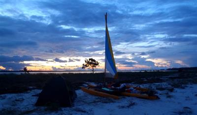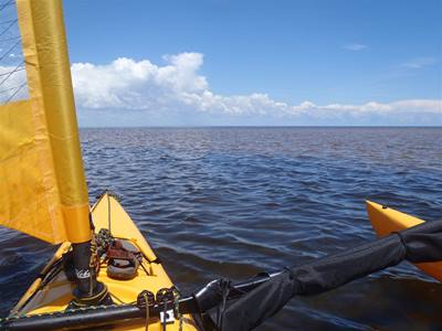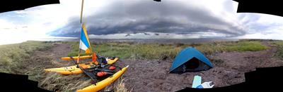 2012-07-12 tl;dr: I actually spent most of the day actually really sailing. And getting rained on. It turns out sleeping on the trampoline isn't that comfortable. And it leaves you very exposed to bugs. That mesh the trampoline is constructed from is no obstacle to mosquitoes. Eventually I set up my tent and climbed in. Good thing, too, because a squall rolled through soon after.For the first time since after the day I purchased this sailing kayak I was actually able to spend most of the day actually sailing. Just as well, too, because I spent several hours gliding over water too shallow to use the peddle drive. It wasn't much of a breeze, though. Just enough to push me along slightly faster than peddling. It was also nice being able to pick up snatches of sleep that I missed last night. As long as I opened my eyes every thirty seconds or so I was good. I am now in the Apalachee Bay part of Florida coast where nobody lives. I barely saw a boat for the second half of the day. Again, probably because of the miles of shallow water. There are no beaches here. It's all mud and grass and oyster beds. The water keeps switching between crystal clear and coffee dark. I ended up camping on a little island near Econfina River State Park. There isn't any dry ground on this island. The only sand here is that which I brought with me. The best I could do was to set my tent up on layers of washed-up sea grass. Which means a big enough storm could send waves right into my tent. Hey, look. A big storm is coming. |