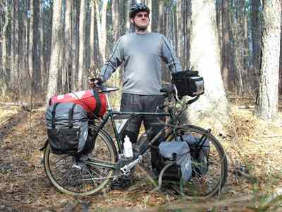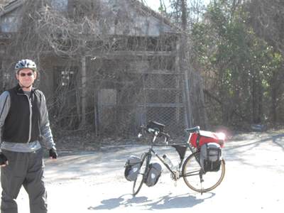 2009-02-08 I know what you're thinking: It's about freakin' time. How many years has it been?So I left Wisconsin yesterday in a rental car and ended up in Greensville, South Carolina this morning. I unloaded my bike, turned in the car, and hit the road. I was a little apprehensive about starting my trip in Greensville as it was by and large an arbitrary location. But a pleasant surprise awaited me. The weather was nice (70s!). The route, though mostly flowing hills, trended toward downhill. A light tail wind pushed me along. And the people here are very kind. Folks in cars gave me plenty of space. Just about everybody outside waved and said hello. The kids are even well behaved. One called off a german shepherd that was chasing me. Another, after being instructed by his father to flip me the bird, did exactly that with no hesitation. There is no green grass here yet, and none of the trees have leaves on them. Oddly enough there are mosquitoes. Even so, it's definitely an upgrade from the snow snow snow I experienced all winter in New York and Wisconsin. As I peddled my way through South Carolina I was struck by the multitude of derelict and abandoned houses. Eventually it occurred to me that I should take a picture of one. Not too much later a beautiful specimen appeared. Very derelict and very abandoned. But just as I was about to stop and snap off a few pictures I realized, no, that house is occupied. My mistake. I doubt if I even covered fifty miles today. But that's okay. I'm totally weak and should take it slow. I know I went at least slow enough for a big black dog to run along side for better than two miles. I set up camp in Sumter National Forest. Route maps are coming. I intend to sleep good tonight. |