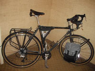2009-02-18 I cannot regale you with epic tales of my travels as I am still in a hotel doing mundane work. But I was asked about my gear, and this seems like as good a time as any to give a description to those who are interested.So that beat-up frame you see in so many of my pictures is a Trek Touring 520. In my mind those rough looks are a bonus in that they contribute toward theft deterrent. The moving parts are all high-end Shimano components. These are the important bits. Tubus front and rear racks hold my four Ortlieb panniers over Planet Bike fenders. I pack those things of immediate need in my Sunlite handlebar bag and Sunlite frame pack. The most comfortable saddle you will ever find is made by Brooks. I think I may invoke the wrath of bike geeks everywhere when I admit that I don't know the saddle's model number, although there is a big S on the side. The whole works is kept off the ground by a pair of Mavic rims and Panaracer tires. Somehow I managed to use both Shrader valve and a Presta valve tubes. (Insert presta valve rant here.) That's my bike. I talked to a guy today who claims to have built a steam-powered bike, so I guess there's always potential for more additions. There is more gear yet to describe, but I will reserve that for another work day. |