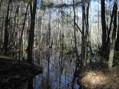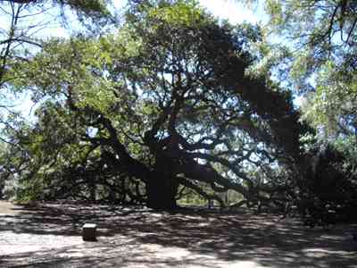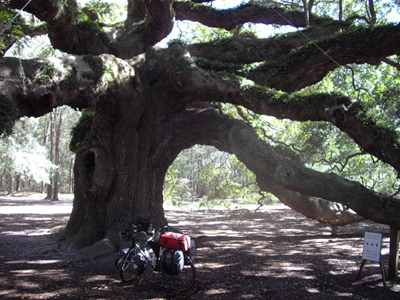 2009-02-20 There was no update yesterday because yesterday was boring.Today: it took me all morning, but I finally built up enough thrust to break free from Charleston's gravitational pull. Doing so required the crossing of Ravenel bridge. Take a look at the picture. It is much bigger than it appears. Fortunately, there is a pedestrian/bike path hanging off its side. Unfortunately, there were several dozen teenagers on the path. These kids had the spatial awareness and reaction time of woolly bears, but they danced around like monkeys. It was treacherous. I also visited Angel Oak. Take a look at the picture. It is also bigger than it appears. Apparently, this is the largest tree on the east coast. Maybe not the tallest, but definitely a thick spidery thing. I spent altogether too much time today on busy roads. In an effort to avoid this, I followed Old Jacksonboro Road. This route started off nice enough with very little traffic. Eventually it began oscillating between pavement and sand. Then I was forced to climb over a gate to continue. Near the end the road was barely a pair of tire tracks through a swamp. But at least there were no big trucks. If I were smart I'd still be hiding out in a hotel. We all know better, though. It never broke 50 degrees today. On my last check it was supposed to drop down to around 25 tonight. In setting up camp near Ritter, SC I deviated slightly from my usual routine in preparation for the cold. I set my hammock up low so that I'm basically laying in the ground. I also donned all of my layers. Now it's just a matter of seeing how much I suffer. Morning update: I slept good until about midnight at which point I realized that my "tent" was collecting too much condensation and my sleeping bag was slowly becoming soaked. So I rolled out of the tent and spent the rest of the night laying on the ground, which was colder but drier. All told my sleeping bag held up like a champ. My thermometer showed 23 degrees when it finally got light out. This explains my frozen water bottles. Also, about a thousand ducks just flew over heading north. That's a good sign, right? |