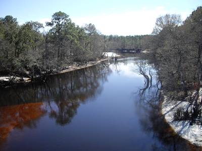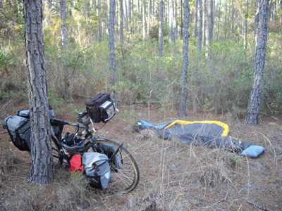 2009-03-04 I'm back in the flat lands. There is a lot of standing water thanks to this weekend's storms. While biking along I considered that if it were warmer in a few weeks that water would spawn swarms of man-eating mosquitoes. Boy was I wrong. I am being swarmed by them now. Normally I would retreat to the shelter of my netted hammock, but a hammock is worse than useless when the temperature falls below forty, which it is supposed to do tonight. So in an odd turn of events I find myself wishing it would get colder sooner. Which is the exact opposite of my attitude this morning. It seemed like I could never get out from under the clouds into the warm sun. The sun finally did find me, though, prompting me to purchase and apply some SPF 50. No more sunburned nose for me. Sadly it has been too cold for me to sunburn any other part of my anatomy. I found a useful piece of road swag today. Somebody lost a Nike backpack. It is barely a sack with strings, but it is light and takes up no space and is exactly what I was trying to find to bring with me. It's probably a girl's bag, but oh well. With my freak bicycle clothes and my freak vibram hiking shoes it should fit right in. At one point I spied a dog sleeping belly up and whistled at it for fun. Bad idea. Immediately three big mutts were giving chase. Let sleeping dogs lie. Something interesting about Georgia: Every road (that I've been on at least) has mile markers. This would actually be cool and helpful if they weren't so random. For instance at one point I was passing eight, nine and ten in what seemed like reasonable times. A few miles later I passed eleven. Shortly after that I passed three. All on the same road. And that was not an anomaly. So I find myself camping in a tree farm (no shortage of those) dotted with palmettos and inhabited by lots of mosquitoes. Where there aren't pines there are oaks draped with spanish moss. There is plenty of green, but it seems to be from plants that don't lose their leaves (which I suspect have a cool scientific name that I can't find right now). Tomorrow I will make my way through Homerville and on south. |