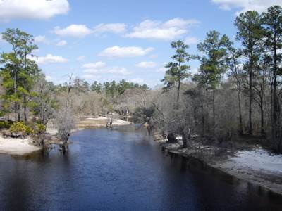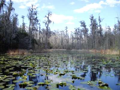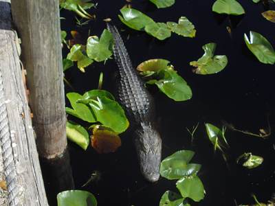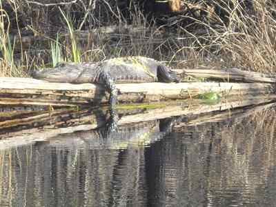 2009-03-05 I sure can't wait until I make it to one of those southern states where I hear the weather is supposed to be nice this time of year. Hey...Wait a second! Climbing on a bike when it's still thirty degrees is tough, especially when the wind chill gods punish you for peddling. Fortunately, the temperature took a forty degree upswing over the course of the day.If you like straight roads and miles and miles of pine trees I can recommend a good route. I had two people flag me down today. Both just wanted to see what I was doing. The first guy was a salesman. The second was retired and lived out of his van as he traveled around the country. It was a nice van. I made it to the Okefenokee Swamp in time for the 3 PM boat tour. Nobody else showed up so I received a personal tour. This allowed for more questions. After she used up the more polite questions, the guide asked me, "so what's up with those shoes?". Freak shoes, remember. I will include a picture another day. Or you can google "vibram fivefingers kso" today. I highly recommend the swamp tour if you happen to be passing through this area. Especially if you like alligators. And spiders. Wait another month for everything to turn green, though. |