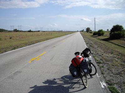 2009-03-13 The first part of my day saw many orange groves. In sharp contrast to the many leafless pecan trees of Georgia, these orange trees were green, and in some case very orange as well.As I was biking along I thought, huh a biplane--you don't see those every day. Turns out I didn't see one today, either, as it was a remote-controlled model. But it was a very big model. Soon I was beyond the oranges and into the ranches. This might as well be Texas with all the cows and trucks and big hats. I was able to see this aspect of Florida while pushing down a long, desolate and dry road. It wasn't long before I was out of water (and sulfur water was never tasting so good). After a bit I found a house and begged some hose water. I was also warned that the system had been recently bleached. It was neigh undrinkable until I added a little sports drink powder. Nothing like lemon-flavored bleached sulfur hose water to quench the thirst. The locals also seem to take great delight in running over pigs. Road kill wild pig is about the ugliest thing you will ever see. I met two other cyclists who I can only assume were on big loops from Orlando or one of the coast cities. They were equipped for speed and quickly left me behind. Eventually I found myself a place to camp--in a dry swamp in a cow pasture past a very official no trespassing sign near yet another noisy highway. In deference to the wild pigs I kept scaring (I only saw two but they've been making noise all evening) I hung my food up in a palm tree and fastened my hammock a little higher than usual. At least I know there are no bears here, as I was told that bears love themselves some pig. And having already seen the pigs, I shouldn't get so shook up when I hear things go crunch in the night. |