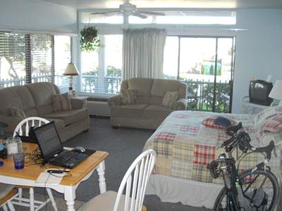 2009-03-30 I probably could have arrived in Cedar Key last night, but I choose to stop just short and camp. I slept pretty good despite the howling (big cats?), calls and cackling (big birds?), and the constant popping (trees?). It also got cold, but the low of 35 degrees didn't hit until I was already on my bike.So this morning I peddled my way the final twenty miles to the island. I arrived too early to check in at the hotel, so I ended up eating breakfast at a cafe opposite the table from Rick, an old razor-challenged sea dog who is piloting his sailboat along the coast. I don't know anything about boats, but he makes it sound like a great experience. I wonder what a small sailboat costs? He may have left already, but if I spot him again I'll try to get a tour of his boat. The hotel room ended up being a fully furnished efficiency apartment with a good view of the ocean, costing less than just about any room I've stayed in so far in Florida. As far as actual destinations go, Cedar Key is the only place I look forward to returning to. This is my third time on this out-of-the-way island. It is everything that the other tourist hotspots in Florida aren't. The only small beach is obviously artificial, because oyster beds and small grassy islands rule. Just about everybody on the island has a fishing pole in their hand. It is a very laid back place. I have a bunch of work to catch up on, so I will be here at least the rest of the week; maybe longer. |