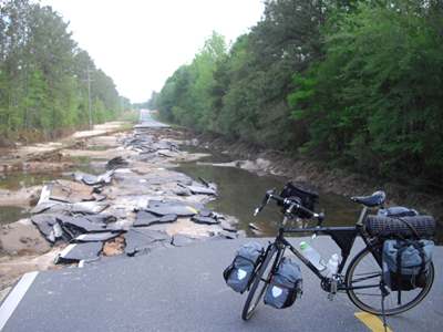 2009-04-12 Tallahassee was kind of a cool looking city with all of its hills and oaks and moss. Tallahassee also offered something else that was lacking throughout much of Florida: back roads. I managed to spend most of today not on highways. Not only are back roads more scenic and less congested, but they also aren't as hot; four-lane highways seem to radiate a lot of heat.I left Florida behind. And Georgia. Again. This area sure received a lot of rain lately, as evidenced by the mosquitoes, flooded fields, washed out roads and floating cars. I can tell I'm no longer in the tourist-saturated lands of Florida because of all the stares and double-takes. At one point I came across a goat stuck in a fence because of its horns. I freed the little guy and it ran and ran until it was out of sight. I didn't think goats could run like that. Most of today's route consisted of hills. I am amazed at how sore I am. Looks like I got a little spoiled lately. I am now in Dotham, Alabama where I will stay for a few days to work. |