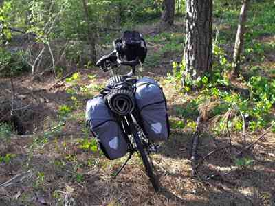 2009-04-22 A couple days ago I went to Wal-mart and purchased a big plastic bin and lid. After paying, I informed the cashier that I was only interested in the lid. I left the bin with her. I cut the lid down and created a support for my rear left pannier. No more sag. The rear right was always held rigid by my laptop case, and it bugged me that they were so asymmetrical.I am used to being stared at, but the folks waiting for the Social Security office to open were freaking me out a little. I needed to get a new card for work. An upcoming customer is making us jump through one bureaucratic loop after another. I had several people comment today that they would like to do a trip like mine but weren't in good enough shape. Believe me, that is the least of your concerns. Take it slow and after two weeks you will be in adequate shape. Then everything else starts getting harder. A local informed me of a possible pack of wild dogs in the area. Now that is a critter I'm scared of. After two months on the road, I experienced my first real bit of road rage. An old white guy honked and flipped me off while glaring at me. In his defense, I had my headphones on and the road was narrow and hilly, so I'm not sure how long he was behind me. He gave me lots of space when he finally passed me, which, oddly enough, puts him in a much more courteous class of driver than the average yahoo who likes to play how-close-can-I-get-to-the-guy-on-the-bike. I saw a lot of horses today. At one point I came around a corner and totally freaked one out. It was pretty funny, but I bet it was bugged that it wasted a perfectly good panic attack what with no rider to kill and all. I stopped for a late lunch at a small seafood joint in Philadelphia. The girl working there was a talker. At one point she was talking about their shrimp, so I asked where they came from. Some were frozen and some were fresh. She then started shuffling crates around. "Wanna see our fresh shrimp? I think they're bad, though." I must admit, those shrimp were huge. I didn't know shrimp got that big. She also didn't know where their crayfish came from, but they were often bagged up with turtles and water moccasins. It hit almost ninety degrees today. With the heat, the sun and the hills I was a little wore out. I think I only did sixty-some miles. |