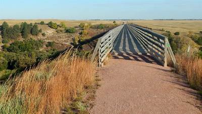 2015-09-27 tl;dr: I biked into Valentine. More broken spokes. Lots of hay. After setting up my camp, a car drove by on the two sandy ruts that I wasn't expecting any traffic on. I was shielded by grass, so I'm pretty sure I wasn't seen. As it was getting dark, a truck came by in the same direction. Later another truck sneaked up while I was reading. I heard some sort of yell or something from the vehicle, so maybe they saw my light, but they kept on driving. Sigh. I packed up camp and moved a hundred yards to a sandy bowl that was much better shielded from the road. If anybody were to actually come back to check on me, at least I'd have warning. Moving camp in the dark, I picked up dozens of sand burs. I'll be picking these things out of my stuff for days.Another broken spoke. I came across a road kill beaver. That was unexpected. I biked the twenty miles into Valentine. I rejoined the Cowboy Trail for the last few miles so I could take the big bridge over the Niobrara River. After eating breakfast at the busy Bunkhouse Restaurant, I checked into a hotel. Another broken spoke. Tomorrow, I should have a new batch of spokes waiting for me at the Post Office. I plan to lace the entire tire again. |