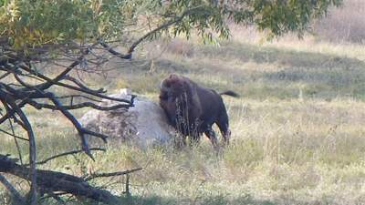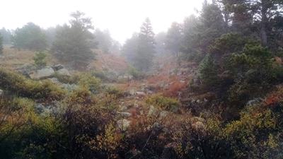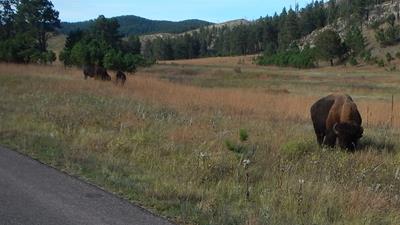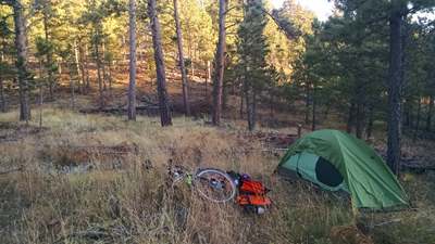 2015-10-09 tl;dr: Left Edgemont via the Mickelson Trail and looped through Custer State Park. Lots of critters and pictures. When I stepped outside this morning there was a hint of sage in the air. Am I so far west?I left Edgemont on the Mickelson Trail. This trail is so much better than the Cowboy Trail. I does follow the highway for a couple miles, but then it breaks off and heads into the wonderful scenery of the Black Hills. In Pringle, I left the Mickelson Trail to head east into Wind Cave National Park and then into Custer State Park. Oh look, a prairie dog! Let me take a picture. An hour later and about a million prairie dogs down the road: Oh shut up with your squeaking, prairie dog! I never did get a good picture. Why can't I breath? Oh yeah, I'm at 5000 feet. I haven't been at this altitude in a while. I had better get used to it. Upon entering Custer State Park I immediately found some pronghorn antelope along the road that just didn't care. This would be the trend throughout the park. Animals here are used to even bicycles. Contrast this to the antelope back in the grasslands that would spot me at a half-mile and bolt. I found a buffalo scratching itself on a rock just before taking a back road into the park proper. I recommend visiting this park. At one point I was pacing an older couple from India in their car. We came across some "wild" burros. I managed to scratch one on the nose. The lady asked me, "are they aggressive?" I told them, "Nah. I think they just want to be fed." The next group of burrows down the road the lady was feeding them graham crackers from the car. Rather than follow paved roads, I turned off onto the park's dirt roads, following Fisherman's Flat Road until it turned into an unruly horse trail. At that point I was pushing my bike, because the trail was just too rough. I ended up camping in some pine trees that had been molested by loggers. |