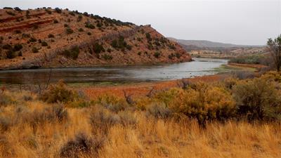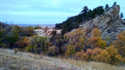 2015-10-22 tl;dr: I peddled from Casper, Wyoming to Independence Rock. Mostly in the rain. Today started off foggy. The sun poked out for all of five minutes, and then it rained the rest of the day. The forecast called for a 30 percent chance for rain. I think we got all thirty percent.Once out of Casper I simply biked the edge of Highway 220 heading west. There are no dirt or side roads here. Fortunately the highway has a wide shoulder. It seemed like I spent most of the day biking along the Pathfinder Ranch. I looked it up. It's 140000 acres. That's a ranch. I made it to Independence Rock Historical Site just before dark. I set up my tent in the rain in the ranchlands behind the rock. The rain was more of a mist, so I wasn't saturated. Also, the rain should keep the temperature from falling too much. |