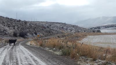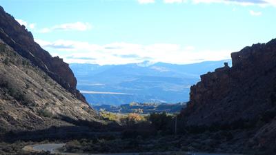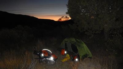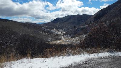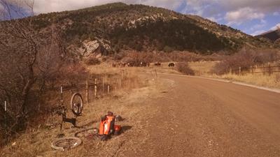 2015-10-30 tl;dr: The road from Meeker to Rifle is very muddy. I left Meeker on County Road 13 rather than Highway 13. For the most part, highways in Colorado are not fun on bicycles. It turns out county roads aren't always fun, either. But it was a better not fun.The road started off paved, and soon switched to dirt, but it was still pleasant riding. At one point the sun even peeked out for a second, but then it hid again and the sky hit me with a bit of snow. As I climbed the road steadily deteriorated. Eventually it was solid mud, and even if I was strong enough to peddle through it I couldn't because my tires wouldn't get grip. Had one of the sneering elk hunters come by at this point I might have thumbed a ride, but (as I saw later) they are all back at their camps drinking beer. Typical. I pushed my bike for many miles and eventually topped out. This pass has three peaks, though. Eventually I started back down, and it was downhill all the way to Rifle. This part of the road faces the sun and quickly improved. As I was fixing a flat tire that the slime couldn't keep up with, a herd of cows came by being pushed by a cowboy and three dogs. Predictably, the cows and the cowboy's horse were unnerved by my bicycle, but him and his dogs kept the herd together. In Rifle I power-washed the mud from my bike. My clothes and shoes will have to wait. I ate a quick dinner and tried to get out of town on a narrow, busy Highway 6 before it got dark. Eventually I found an old washed-out road that lead behind a small hill that shielded me from the sound of Interstate 70. I set up camp to the sound of the oil compression stations. No I don't know what a compression station is, but they make a lot of noise. |