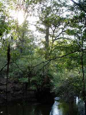 2005-09-25 Today I drove up to the Osceola National Forest which also supports the Florida Trail. I hiked along an interpretive trail in Olustee Battlefield Historic State Park (about 40 miles West of Jacksonville), site of one of the bloodiest battles of the Civil War as far as Florida is concerned. Apparently, part of the movie Glory was filmed here. That area of Florida is nothing but sand and pine trees. Okay, there is the ever-present palmetto, too. Many of the pine trees are on farms, the only difference between them and their wild brethren being the farm pines grow in endless rows like corn. Next up: Suwannee Springs. There's a spring there that gushes brown rotten-egg-smelling water into the already tannic-stained blackness of the Suwannee River. Many people swim there. I took to the water as well in the guise of swimming, but was really taking a bath. (To be sure, the semi-bath I enjoyed the previous day in a horse-watering trough hadn't yet completely worn off.) If you push your hand a foot into the water, you can no longer see it due to the water's blackness. If it wasn't for the other swimmers, I would have been very hesitant to enter the water. The forest around the river is pretty cool. It's thick and dark with many vines and hanging moss and can best be described as something you would find Scooby Doo and gang sneaking around in. From Suwannee Spring I drove a few miles West to Holton Spring. After a long drive into the woods, I AM now camping once again on the Florida Trail. Technically, I'm supposed to be out of here by dark. Oh well. This area also has the cool dark forest, but there are also massive cypress in the Holton Creek. There are sink holes everywhere, some filled in with water, some not. Holton Creek itself could almost be called a river. Even with all that water, it starts only a couple hundred yards up from here at the spring. Springs in this part of the country are serious. I spent many a mile today driving along sections of the Florida Trail, always revealed by its distinctive orange slash. Again, this is part of the reason I gave up on the thru-hike. What's the point of walking down a road? Critters: a feral cat passed by just before dark. With its bushy tail, I thought at first that it was a fox. |