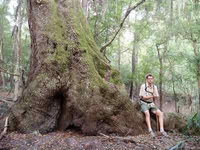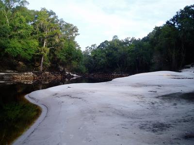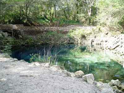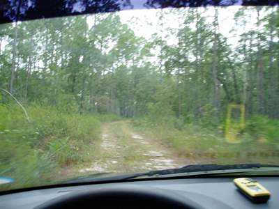 2005-09-26 My next stop of the day was Blue Springs State Park. There's a spring there. And it's blue. I drank some of the water gushing out and it tasted remarkably good. Interestingly, there is a Deer Park bottling plant just down the road. South from Blue Springs almost to the Gulf Coast brings me to Econfina River State Park. (I don't know how to pronounce it either.) This park offered miles of hiking trails that could have actually been quite nice had they been maintained. As it was, as I hiked along the grass-covered trails I managed to pick up a dozen or so of those little tiny ticks that you can barely see and even some of the ticks that you can only see if somebody points them out to you. I'll be feeling crawly things all over my body for days. The trails also supported numerous spider webs. Most webs had a big spider in the middle which made them easy to spot and avoid. The rest I managed to knock away with my face. Eventually the trail deteriorated to the point that I lost it and had to depend on Patch Glitch (my GPS) to lead me half of the way back to Medo before picking the trail up again. Walking without a trail isn't much fun in Florida. Patch Glitch is the name of my GPS. My original GPS was named Glitch, after Glitch from the cartoon, "Reboot," as in, "Glitch! Game stat?" After Steven C slammed Glitch in a truck door and I accidentally left it in Colorado, I acquired a new GPS with a very touchy power button that was fixed by super-gluing a rubber "patch" around the button, making it harder to press in. A la Patch Glitch. Anyway, I'm now in the Apalachicola National Forest where I'm discovering that Medo (my car, for those who forgot) is definitely not a jeep. I was planning on driving across the forest land on these small "roads," but decided against it after a bit. Medo has limits. This forest is once again mostly pine trees. While eating dinner, I was harassed by house flies--yep, plain old house flies. Unlike most of the insects down here, house flies don't sting or bite or attempt to draw blood, so I was amazingly tolerant of them. On a personal note, I really need a hair cut. Not too concerned with style on this homeless trek, I was putting it off. (Wearing the same pants for four weeks erodes your fashion consciousness.) However, after today's tick-fest, I'll be forever feeling things crawling over my scalp that I can't root out.
