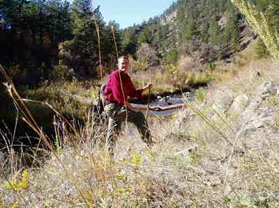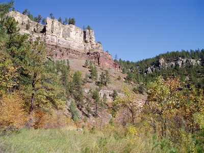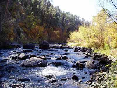 2005-10-06 Then I hiked up along Rapid Creek just inside of the Black Hills National Forest boundary. Very scenic, especially if you like ponderosa pine and granite and deep, narrow valleys. While hiking back to the car I met a guy working on the road. He informed me that yesterday a man shot a 141 pound lion right where I had hiked through today. The news said that mountain lions around here sleep on porches and get hit by cars, but it didn't say anything about them eating people. Maybe it's just those California lions, California being so liberal and all. From there I stopped by two closed restaurants hoping for a burger, drove down to Silver City to survey my hiking plans for tomorrow, and then I returned to this parking spot to spend the night. No drama. No stories. And I didn't do anything unusually stupid. |