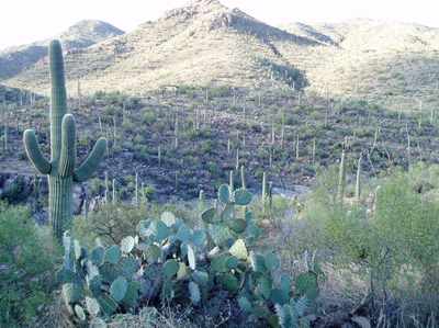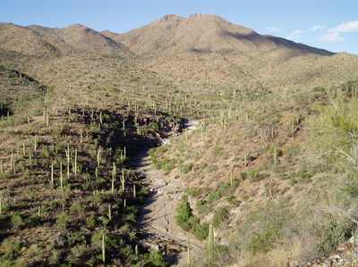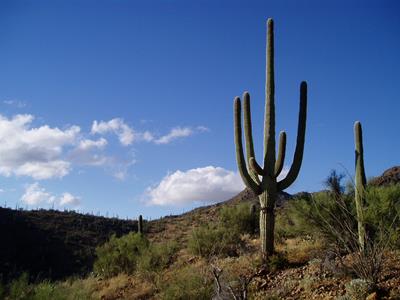 2005-10-18 Because I had parked next to a railroad, I placed some coins on the track before going on my hike. Trains squish coins real good. I continued East on I8 through an immigration checkpoint. I was let through with just a glance, but I saw that two other guys were having their van searched. I think they were being wrongly profiled. Sure, one had long stringy black hair and the other a blond spike rising a foot above his head, but neither looked Mexican. Near Tucson, I stopped at the Western Saguaro National Park and hiked a few miles through the cacti. I came across a really cool looking grasshopper and later saw a tarantula. |